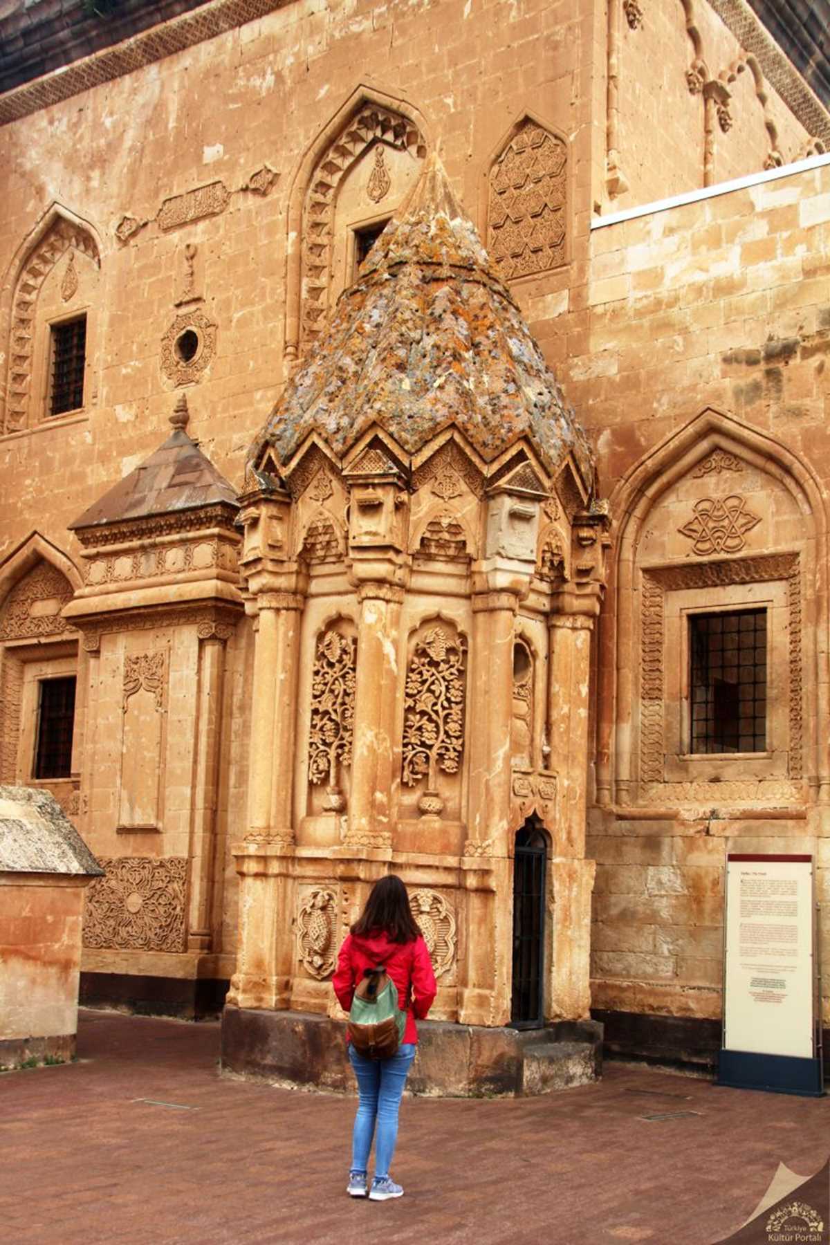 Kime ait olduğu bilinmemekle beraber İshak Paşa’nın yattığı düşünülen sekizgen planlı türbe, hareketli cephesiyle dikkat çekiyor. Ayrıca avluda, bölge halkı arasında 'süt çeşmesi' olarak bilinen, bir musluğundan süt, bir musluğundan su aktığı söylenen bir çeşme bulunuyor. Çeşmenin üzerinde, su ile gül arasındaki aşkı sembolize eden bir damla motifinin içinde kıvrık dal ve yapraklarla birlikte işlenmiş gül motifi oldukça ilgi çekici detaylardan biri.