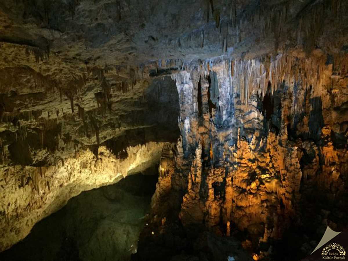 Mağaranın en can alıcı noktası ise deniz suyunun beslediği parıltılı göldür. Deniz akıntısıyla bağlantılı derin kısımları kasvetli olabilir ama yüzeyi çarşaf gibidir. Mağarada, en karanlık kaya girintilerini mesken tutan bir yarasa topluluğu var.