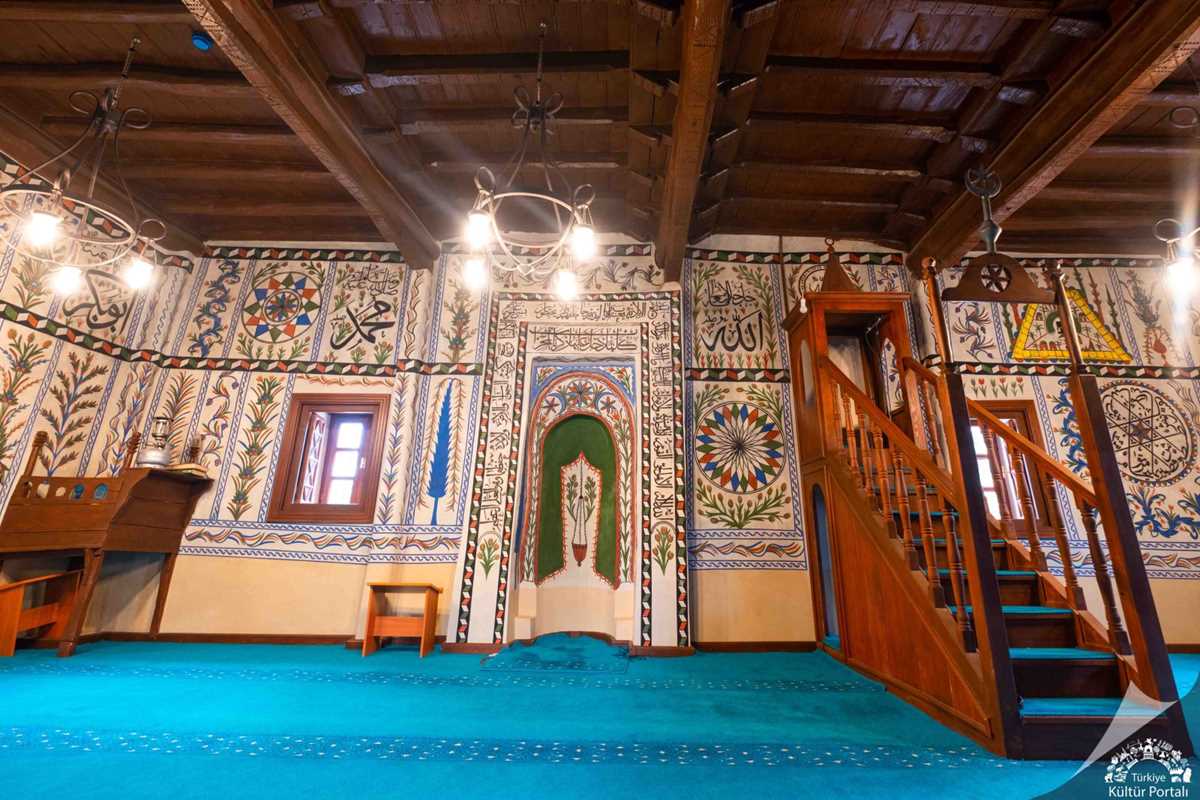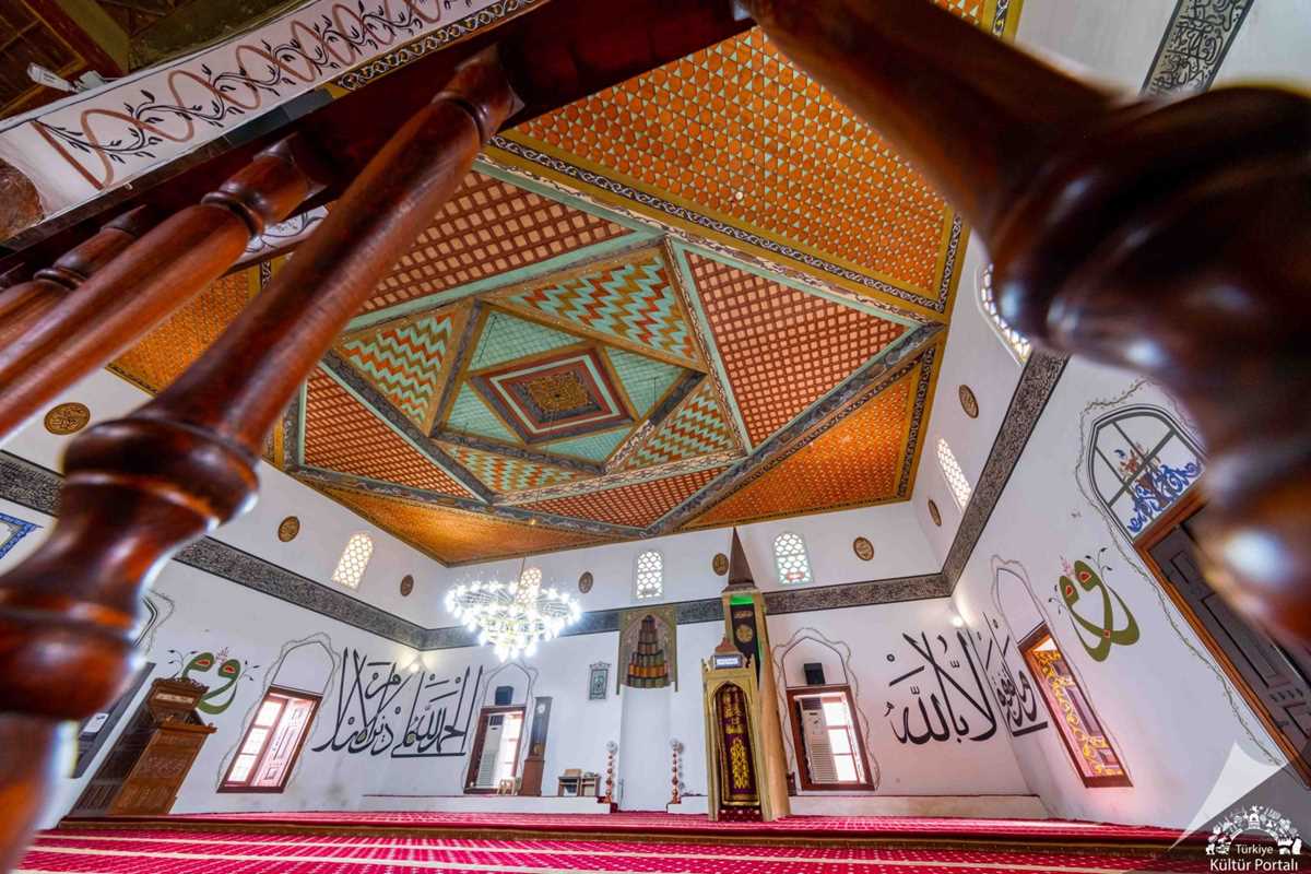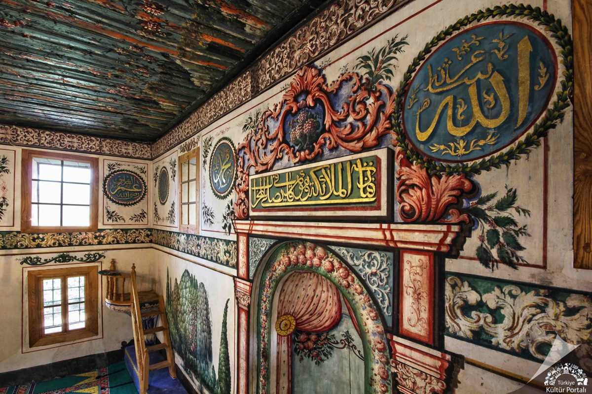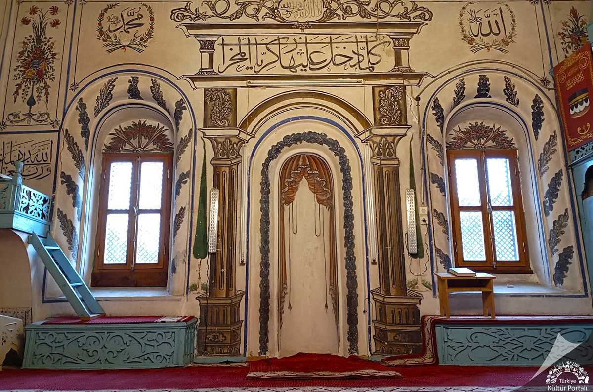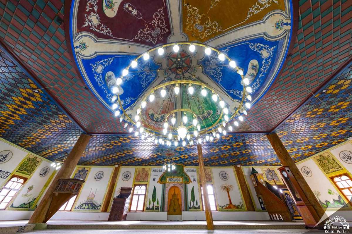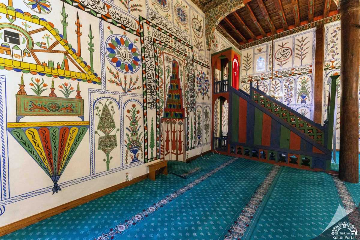Afyonkarahisar’ın Sandıklı ilçesinde bulunan cami, 1379 yılında inşa edilmiştir. Caminin içindeki süslemeler 19. yüzyıl Osmanlı mimarisinin süsleme özelliklerini yansıtır. Duvar resimlerinde çam ağaçları, sarmaşıklı çiçek motifleri, kıvrık dallı ağaçlar, su kovaları, vazolu ve sepetli çiçekler, asma yaprakları ve üzüm salkımları arasındaki vazoların üzerinde girland motifleri görülür. Duvarlara ve kubbeye ayetler ve dini yazılar bezenmiştir. Kubbede Sultanahmet ve Tophane Camii tasvirleri de bulunur. Bunlar, devrin perspektif anlayışına göre minyatür tipte yapılmıştır.