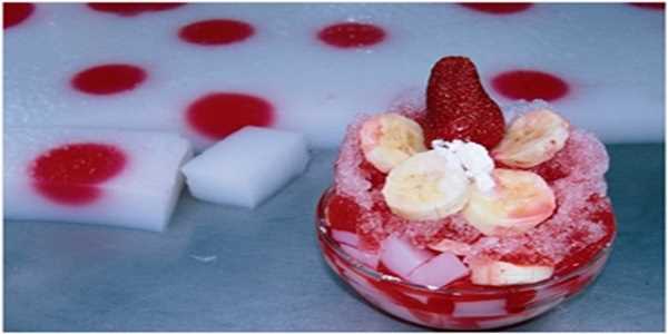 Buzun üzerini havuz biçiminde açarak ortasına dilediğiniz miktarda pudra şekeri koyuyoruz, yine dilediğiniz miktarda gül suyu koyuyoruz, yukarıda sayılan meyvelerden dilediğinizi dilimleyerek üzerini süsleyebilirsiniz. En son aşama olarak da kaynatıp soğuttuğunuz bici biciyi boyalı sudan buzun üzerine yavaşça döküyoruz. Çok fazla koymamanızı tavsiye ederiz çünkü buz eridiğinde taşma ihtimali var.