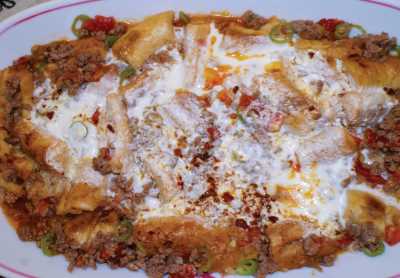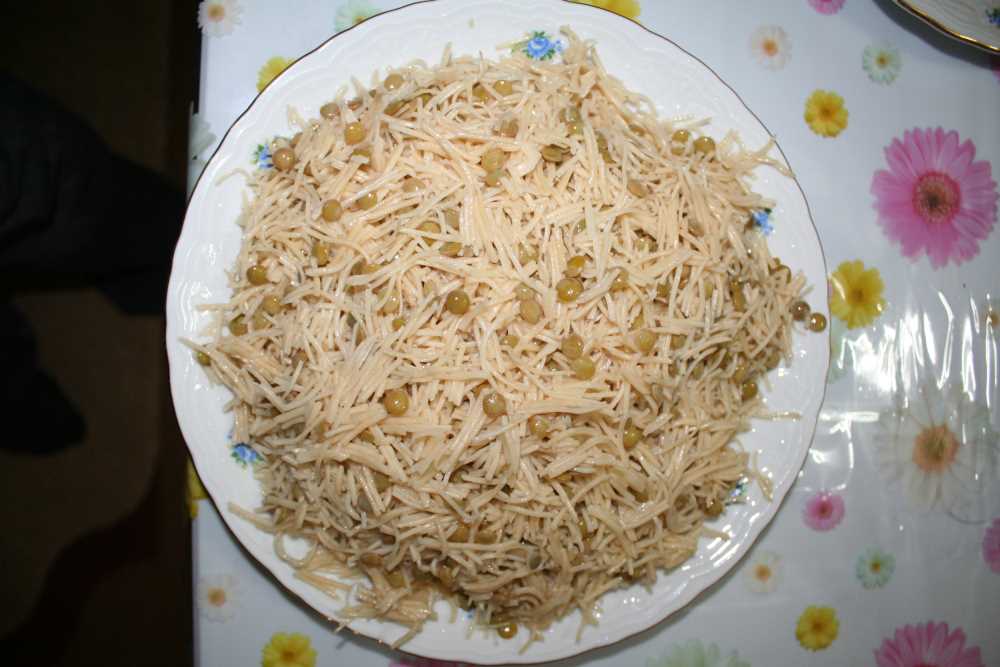 Evde kesilen erişte ve yeşil mercimekle hazırlanır. Önceden haşlanan yeşil mercimek, erişteyle kaynatılıp süzüldükten sonra yağlanmış tencerenin tabanına patates dizilir, üzerine mercimekli karışım konur. Son olarak üzerine kızdırılmış yağ gezdirilir ve patatesler kırmızı renk alıncaya kadar pişirilir. Ters çevrilip servis edilen bu yemek, kimi zaman patates yerine lavaş ekmeği ile de yapılır. Kaynakça:" (2011). Ağrı Kültür ve Turizm Rehberi."