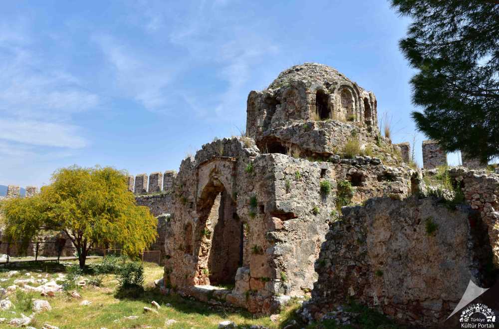 İçkale’nin hemen hemen orta bölümündeki alanda bir şapel bulunmaktadır. Selçuklu dönemine ait olan bu yapı yonca planlıdır. Mimari özelliklerden dolayı 12. yüzyıla tarihlenmektedir. Alaeddin Keykubad zamanında, kalenin savunmasını güçlendirecek çok sayıda anıtsal yapı inşa edilmiştir. Selçuklu sanatının eşsiz örneklerinden biri olan Kızılkule bunlardan biridir. Deniz kenarında kırmızı taş ve tuğladan inşa edilmiş 33 metre yüksekliğinde sekizgen yapılı Kızılkule, Alanya’nın simgesi durumundadır. Selçukluların Akdeniz ile tanışmalarını simgeleyen tersane ise 1227 yılında inşa edilmiştir. Tersaneyi güvence altına almak için yapıldığı sanılan tophane 12x14 metre ölçülerinde, iki katlı ve dikdörtgen planlı bir yapıdır.