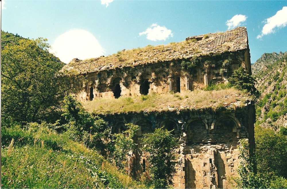 Kilise, plan açısından Barhal Kilisesi’ne benzemektedir. Yöredeki Ortaçağ Dönemi manastır oluşumunu en iyi biçimde yansıtmaktadır.Manastır, kompleks bir yapı olup, Kilise, Trapeza ve seminer odasıyla bu yapı topluluğunun güney doğusunda ayrı olarak inşa edilen şapelden oluşmaktadır. Manastır dört farklı yapıdan oluştuğu için, tarihi kaynaklarda olduğu gibi, günümüzde de “Dört Kilise” olarak anılmaktadır. Kilise, Manastırın odak noktasını teşkil eden yapı üç neftli bazilikal planlı olup, dıştan 28.40x18.65 m ölçülere sahiptir. Kilisenin doğu cephesi düşey olarak iki farklı yüksekliğe, yatay olarak üç kademeli bölümden oluşmaktadır. Ortada apsis, yanlarda ise, pastoforion odalarının bu yöndeki yüzeylerini içermektedir. Üçgen alınlıklı bölüm iki kademeli, yuvarlak kemerli arkadlarla hareketlendirilmiştir. Cephede simetrik olarak düzenlenmiş yuvarlak kemerli dikdörtgen formlu pencereler bulunmaktadır. Cephenin her iki yanında Prothesis ve diakonikon düzenlenmiştir. Kuzey cephe iki katlı olarak karşımıza çıkar. Alt kat kuzey yan nef ve prothesis, üst kat ise orta nefin bu yöndeki yüzeylerinden meydana gelmiştir. Batı cephe, genel düzenlenmesi doğu cephesiyle aynıdır. Ancak, buradaki cephenin alt bölümüne, dikdörtgen planlı narteks eklenmiştir. Cephe her üç nefin bu yöndeki yüzeylerinden oluşmaktadır. Yapının güney cephe düzenlemesi tümüyle kuzey cepheyle aynıdır.Orta nef çift pahlı, yan nefler ise, tek pahlı çatı ile örtülmüştür. Yapının tüm çatısı bozulmuştur. Özellikle orta nefin güney kanadı en çok etkilenen bölümdür. İç mekanda simetrik olarak yerleştirilen sekiz haçvari serbest paye üç nefe ayrılmıştır. Ortadaki nef daha geniş ve yüksek yanlardaki birbirine eşit ölçülere sahiptir. Orta nef beşik tonozla örtülmüştür. Nefin doğusunda dikdörtgen planlı bema yer alır. Bemayı yarım daire şeklinde apsis çevreler. Apsis dışa taşıntı yapmadan, yarım kubbe ile vurgulanmıştır. Apsisin iki yanında ikişer kattan oluşan, düzenlemeleri aynı olan dikdörtgen planlı pastoforion odaları bulunmaktadır. Alt kattan seyyar birer merdivenle çıkılan üst kat pastoforion mekanlarının her biri ikişer dikdörtgen planlı, birer ise armudi formlu hücrelere sahiptir. Yapı, çeşitli nedenlerden dolayı, tahribe uğramıştır. Yapıda, zengin olmasa da, mimari plastiğe halen bir bölümü günümüze ulaşan freskli ve doğal boyadan oluşan süslemelere rastlanmaktadır. Cephede kabartma olarak yapılan süslemeler, geçme şeklindeki çeşitli geometrik ve bitkisel motiflerden oluşmaktadır. Kilisenin süsleme açısından önem arz eden freskleri tüm olumsuzluklara rağmen, günümüze ulaşmıştır. Apsiste yer almaktadır. Aziz Nino’nun olabileceği vurgulanan elinde bazilikal planlı bir Kilise ile birlikte sunulan fresko hala canlılığını muhafaza etmektedir.