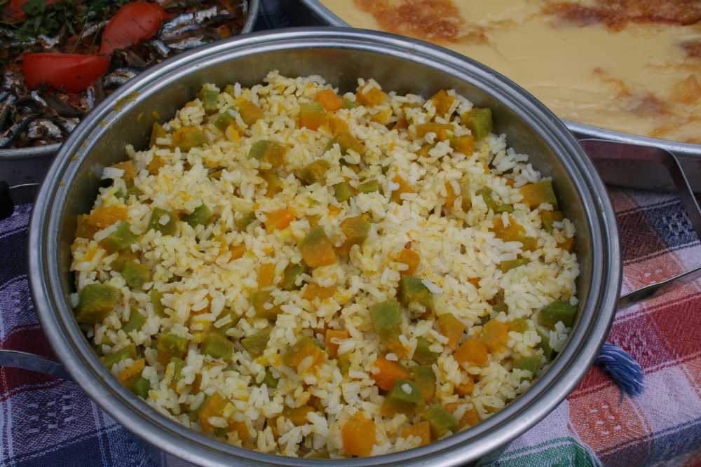 Pilavlık pirinç ve ince doğranmış bal kabağı birer sıra tencereye konur ve karıştırılmadan az ateşte pişirilir.Tercihen tere yağı kullanılır