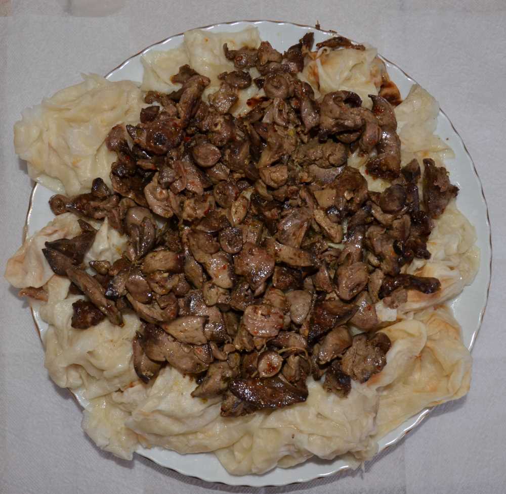 Parçalara ayrılan yufkalar kaynayan tavuk suyunun içine atılır ve bir arada toplanır. Tabağa alınan yufkanın üzerine, ayrı bir kapta sıvıyağda kavrulup pul biber ile harmanlanan tavuk ciğeri dökülür.