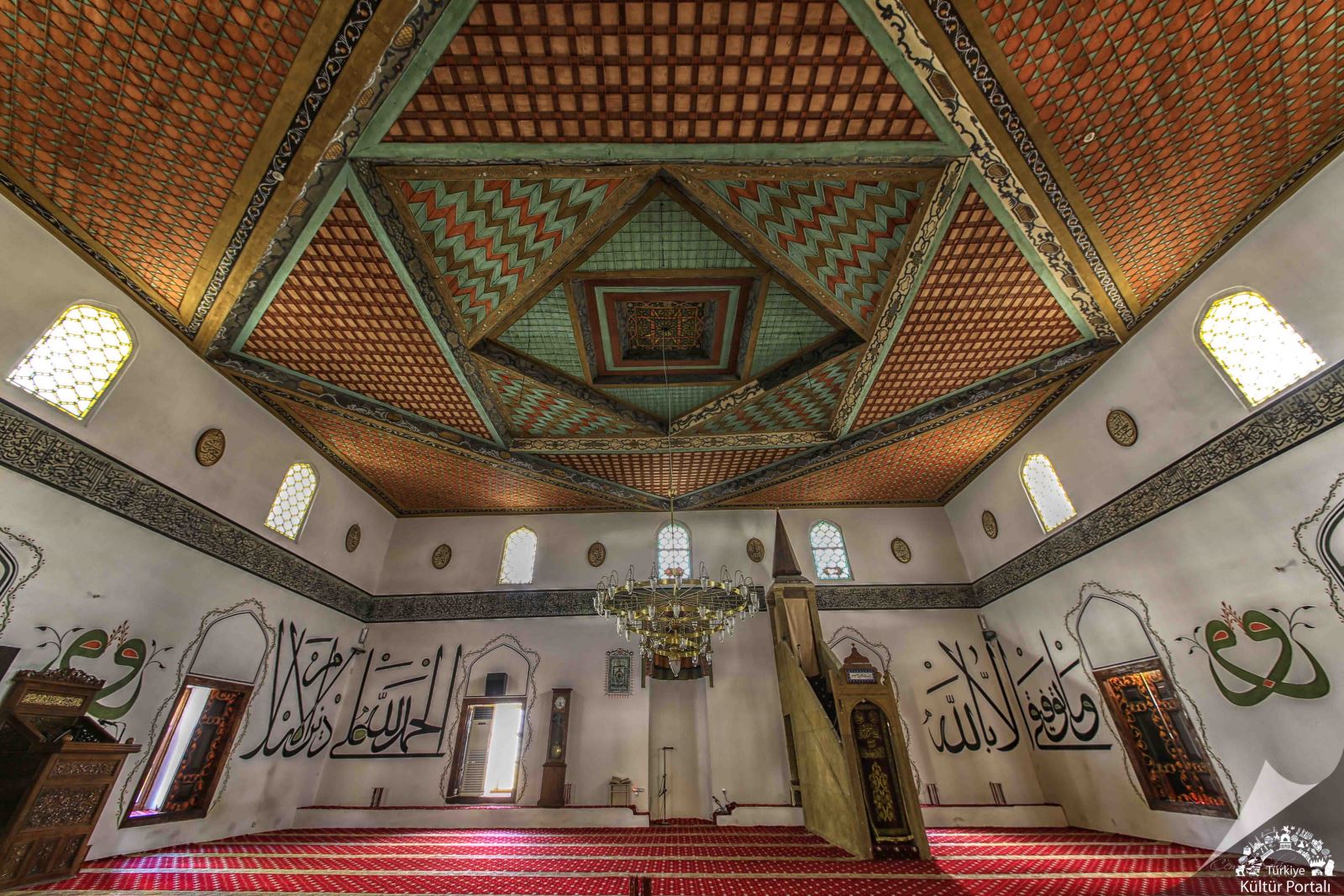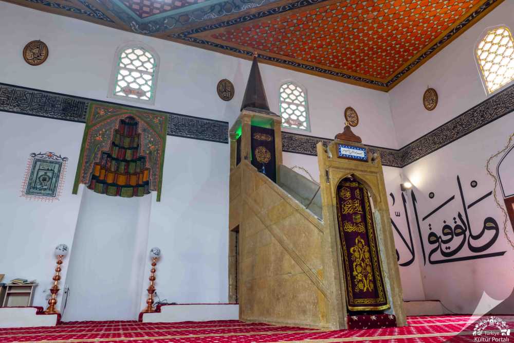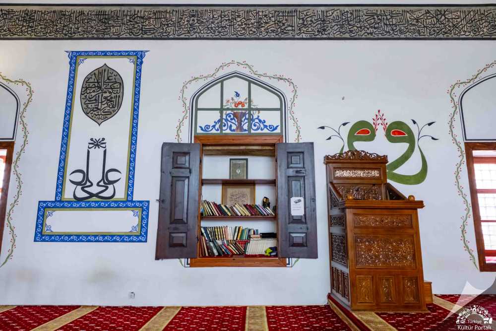 Caminin içinde, süsleme olarak hat sanatı ön plandadır. Bunlardan biri, mahfilin batı ucundan geniş bir kuşak halinde başlayan batı, güney ve doğu duvarlarının üst kısmında devam eden Fetih Suresi’dir. Pencere aralarındaki boşluklara iri harflerle, “Vav”, “Ali”, “Elhamdülillah”, “Muhammed” ve “Hû” ifadeleri yazılmıştır. Cami mihrabının solunda ise Kâbe tasvirli çini bir pano yer alır. Açık mavi zemine sahip olan panonun etrafı, sarmaşık şeklinde düzenlenmiş rumilerle çerçevelenmiştir.