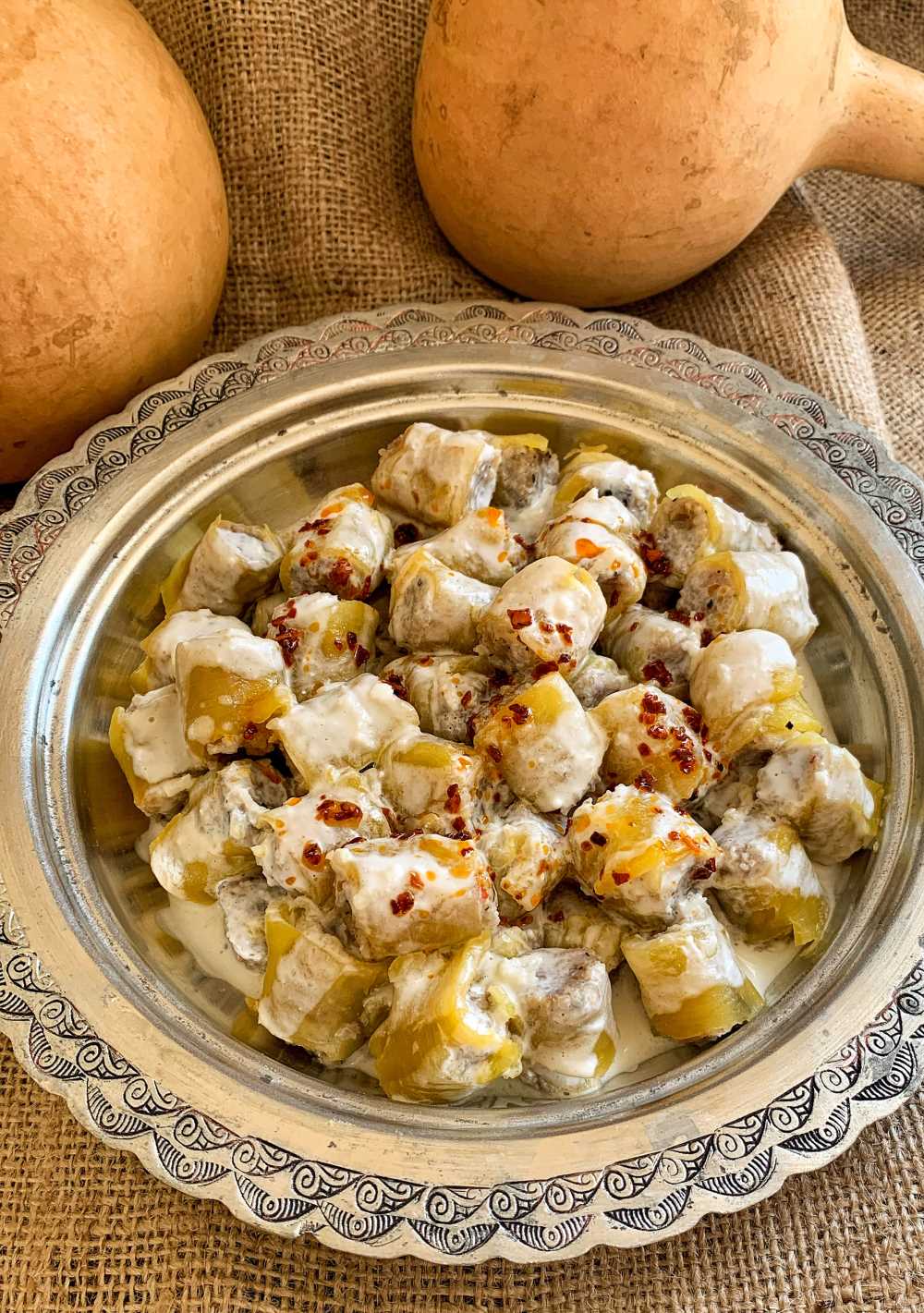 Yazın taze kabak, kışın ise kışlık sakız kabağı ile her mevsim yapılabilen yöreye özgü bir yemektir. Soyulan kışlık kabak ortadan ikiye bölünüp çakı ile 2-3 mm kalınlığında tabaka şerit/ sarma çekilerek tuzlanır ve bir gün dinlendirilip sarma yapılacak kıvama getirilir. Et, soğan ve yeşil biber birlikte makinada iki defa çekildikten sonra bulgur, yumurta, reyhan, kimyon, karabiber, pul biber ve tuz karılıp yoğrulur. Yoğurma işlemini yapılırken bir kâse su bulundurulup ara sıra bir avuç su alınarak köfte harcına dökülür. Hamur katılaştıkça az su vurularak ele yapışmayacak hamur kıvamını alıncaya kadar yoğurulur. Baş parmak kalınlığında alınan hamur avuçta sıkılıp dolma şekli verilerek teker teker kabak sarılır. Ssağ el baş ve işaret parmakları arasında sıkılarak hazırlanan dolmalar açık uçlar alt ve üste gelecek şekilde tencereye sıralı dizilir. Üzerine ters çevrilmiş tabak konulup dolmaların üzerine çıkacak seviyede sıcak su eklenerek 40-45 dakika pişirilip suyu süzülür. Sunum tabaklarında üzerine su ile açılmış sarmısaklı yoğurt ve biberli tereyağı sos dökülüp sıcak olarak sunulur.