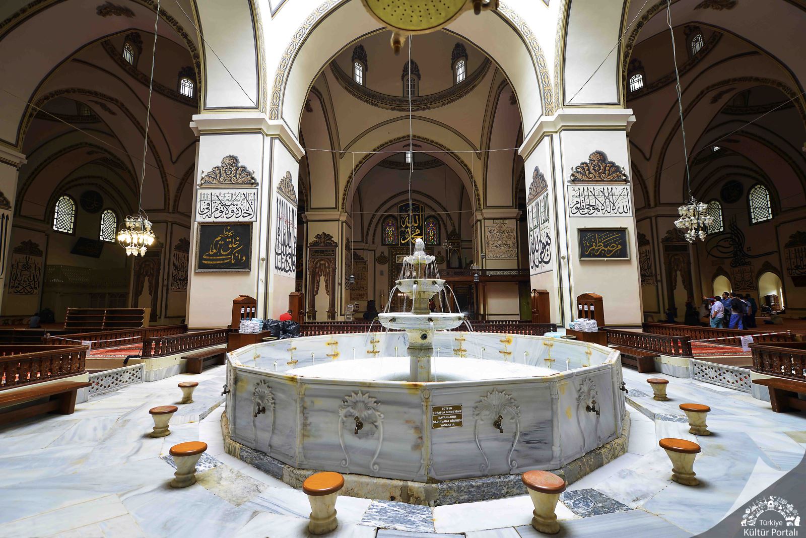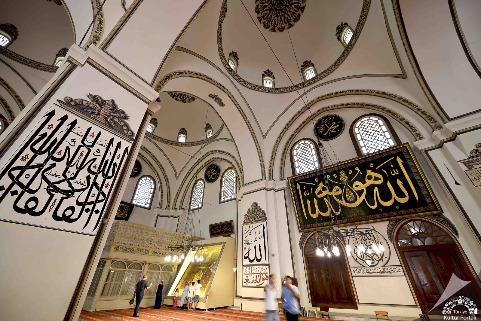 Ulu Cami’nin iç duvarlarını süsleyen levhaların çoğunun altında, hattatının imzası bulunmaktadır. Büyük çoğunluğunun eksikleri Hattat Şefik Bey tarafından düzeltilmiş veya yeniden yazılmıştır. Cami içinde 13 ayrı yazı karakteri ile 41 ayrı hattat tarafından, duvara yazılmış 87 levha halinde, 192 adet yazı mevcuttur. Ayrıca çok değerli saatler, şamdanlar ve Kur’an-ı Kerim'ler bulunmaktadır.