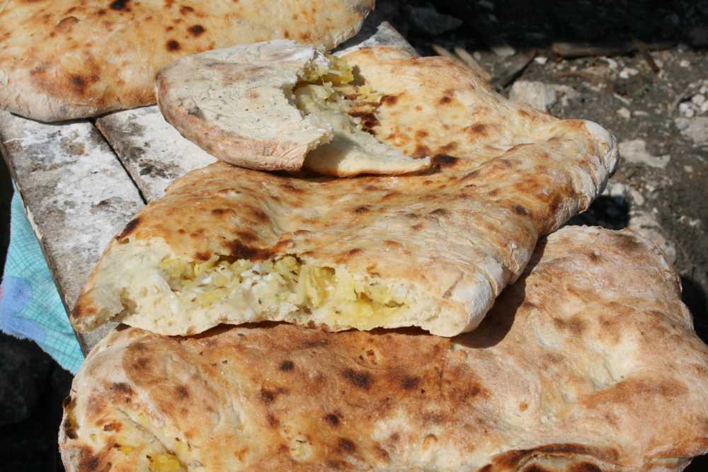 Traditionally, on certain days of the week, before making bread in the village ovens, it is done using different ingredients to adjust to the low temperature of the oven and to make the bread in a short time. Flour, water, salt and yeast are used to knead the dough, then a clean cloth is laid on the dough for the yeast to take effect. In recent years, women are kneading dough with bread dough they buy from bakeries. The bread dough is multiplied with flour, water and salt in a large container. The pumpkin and potatoes are boiled and strained to be put in the dough. Then it is kneaded when the yeast is matured. A soft dough is obtained, the dough is made of beads and opened by hand into a thin layer and liquid oil is poured over. There are multiple choices for the internal ingredient ; walnut, potato, minced meat, plain onion, roasted meat, pieced meat, spinach, cheese varieties etc. After the inner ingredient is placed in the middle of the dough, the sides of the dough are folded toward the middle. It is cooked in a medium-hot oven until it is baked.