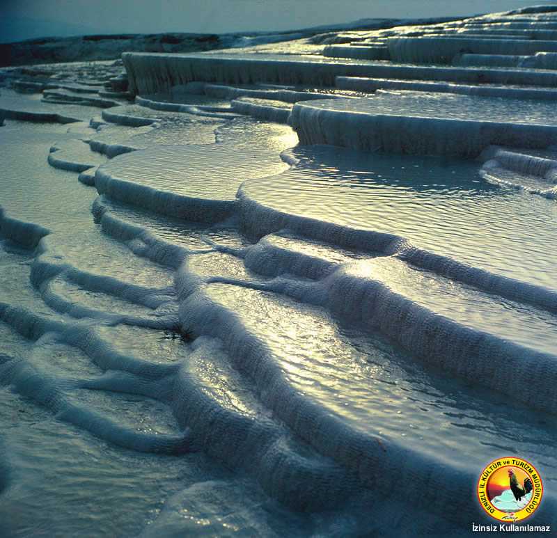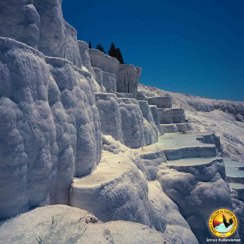Traverten çok yönlü, çeşitli nedenlere ve ortamlara bağlı, kimyasal reaksiyon sonucu çökelme ile oluşan bir kayadır. Pamukkale termal kaynağını meydana getiren jeolojik olaylar geniş bir bölgeyi etkilemiştir. Bu bölgede sıcaklıkları 35-100 C arasında değişen 17 sıcak su alanı bulunmaktadır. Pamukkale termal kaynağı, bölgesel potansiyel içindeki bir ünitedir. Kaynak, antik dönemlerden beri kullanılmaktadır. Termal su kaynaktan çıktıktan sonra, 320 m uzunluğunda bir kanal ile traverten başına gelmekte ve buradan, 60-70 m.lik kısmi çökelmenin olduğu traverten katlarına dökülmekte ve ortalama 240-300 m. yol kat etmektedir. Kaynaktan çıkan 35.6 0C sıcaklığında, içinde yüksek miktarda Kalsiyum Hidrokarbonat bulunan suyun havadaki oksijen ile olan teması sırasında Karbondioksit ve Karbon monoksit uçarak kalsiyum karbonat çökelmekte ve traverten oluşumuna sebep olmaktadır. Çökelti ilk etapta jel halindedir. Reaksiyon kimyasal olarak; Ca(HCO3)+O2 CaCO+CO2+CO+H2O şeklindedir. Kat kat havuzcuklarında ve kat kat seddelerinde, çökelmekte olan kalsiyum karbonat, başlangıçta yumuşak bir jel halindedir. Zaman içinde sertleşmekte ve traverten olmaktadır. Ancak ziyaretçiler tarafından katlar üzerinde gezilmesi ve oynanması, henüz yumuşacık haldeki kalsiyum karbonatların ezilmesine, dağılmasına neden olmaktadır. Travertenlere termal su kontrollü olarak belirli bir program dahilinde verilmektedir. Fazla miktarda ve uzun süre aynı yere akıtılan su yosunlaşmaya ve dolayısıyla travertenlerde hoş olmayan kirliliğe sebep olmaktadır. Beyazlığın oluşumunda, hava şartları, ısı kaybı, akışın yayılımı ve süresi etkilidir. Çökelme, termal sudaki karbondioksitin havadaki karbondioksit ile dengeye gelinceye kadar devam etmektedir. Yerinde yapılan analizlerde, kaynak başındaki suyun karbondioksit miktarı ortalama 725mg/1 iken, suyun travertenleri terk ettiğinde bu miktar 145mg/1'e düşmektedir. Keza kalsiyum bikarbonat da benzer şekilde 1200 mg/1'den 400 mg/1'e düşmektedir. Keza Ca 576/8mg/1'e düşmektedir. Bu analiz sonucuna göre, 1lt. sudan traverten üzerine 499.9mg. CaCO 3 çökelmektedir. Bu miktar 1 1/sn. su için günde 43191 g. Çökelme demektir. Ortalama yoğunluğu 1.48g/cm 3 alan kaplar. Suyun ortalama debisi 466.21/sn. olduğuna göre 13584 m2 alan beyazlatılabilecektir. Pratikte bu şartları yerine getirmek güçtür. Ancak bu teorik yaklaşıma göre yılda 1 mm. kalınlığında 4.9 km2 alan beyazlatılabilir. Kültür ve Turizm Müdürlüğü