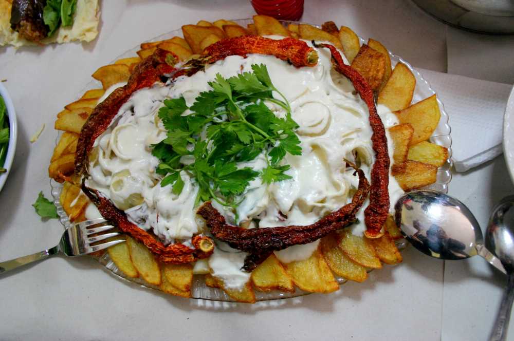 HAZIRLANIŞI: Patlıcanlar ve biberler soyulup, dilimlenir. Haşlanıp suyu süzülerek kızartılır. Patatesler ve soğan soyulur, dilimlenir ve kızartılır. Kızartılan malzemeler servis tabağına alınarak üzerine sarımsaklı yoğurt dökülür. SERVİS: Sıcak ve soğuk servis yapılabilir. Tarif: Sezer DİNÇER Denizli İl Kültür ve Turizm Müdürlüğü Yöresel Yemek Yarışması