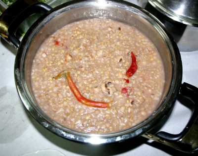 HAZIRLANIŞI: Nohut bir gece önceden ıslatılır. Kuşbaşı et bir tencerede kavrulur. Salça, içine kırmızı toz biber ve su konularak biraz ezilir. Kavrulan etin içine ezilen salça eklenir. İçine su, tuz ve nohut eklenir ve bir süre kaynatılır. Soğanların kabukları soyulur ve tuzlu suya atılır. Daha sonra tuzlu sudan çıkarılır ve yıkanarak kaynayan yemeğin içine atılır . Yemek pişirilir. SERVİS: Sıcak olarak servis yapılır. Tarif: Nuran SILAN Denizli Kültür ve Turizm Müdürlüğü Yöresel Yemek Yarışması