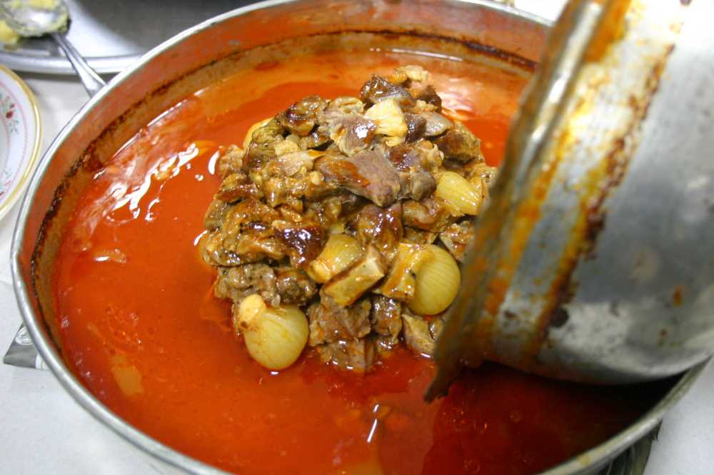 HAZIRLANIŞI: Bir tepsinin ortasına etlerin yapışmaması için iç yağı konur. Üzerine bir sıra et, etin üzerine soğan döşenir. Bu işleme et ve soğan bitene kadar devam edilir. Aralarına karabiber ve tuz serpilir. Yeşilbiber konur. Malzemenin tamamı bittikten sonra üst üste konulan malzemenin üzerine çukur bir tabak kapatılır. Üzerine kaynarken oynamaması için ağırlık konur. Sonra eritilen salçalı su dökülür kısık ateşte pişirilir. SERVİS: Sıcak olarak servis yapılır. Tarif: Arife KADIKÖYLÜ Denizli İl Kültür ve Turizm Müdürlüğü Yöresel Yemek Yarışması