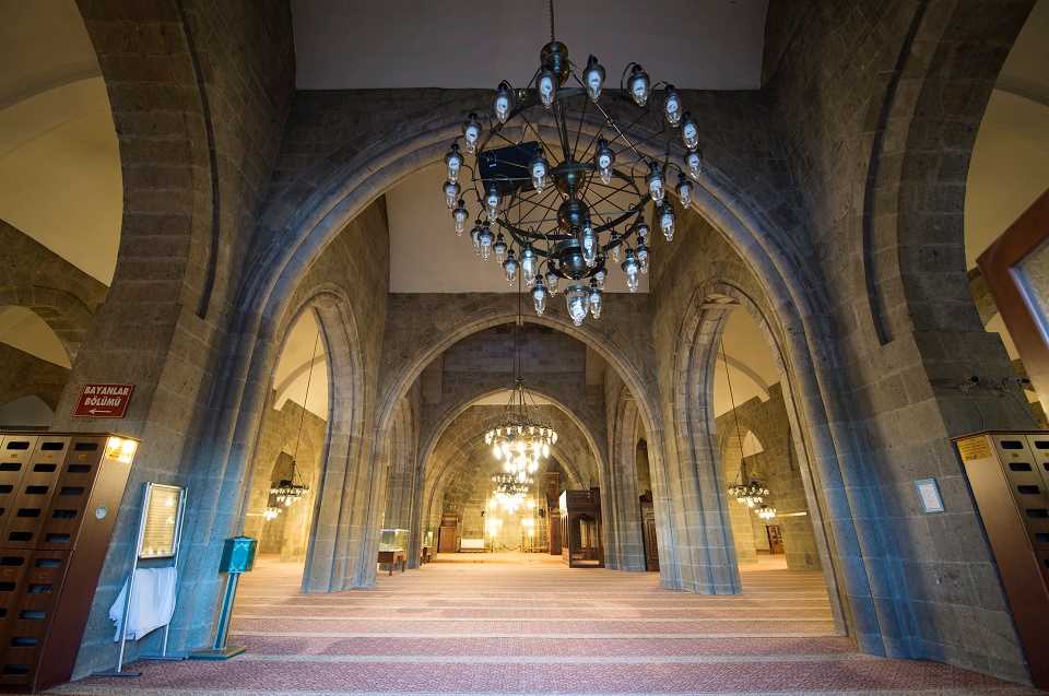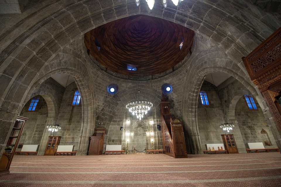 The Grand Mosque was built by Nasreddin Aslan Mehmet who is an Emir of Saltuks in the year 1179. Owing to the fact that the name of “Atabeg” by Saltuks, it is also called “Atabeg Mosque”. The building which has an upper structure that is perpendicular to the mihrap (niche showing the direction to Mekka) wall is supported by 28 independent L, T and rectangular shaped pedestals consist of seven naves including a wide central nave and three additional naves on either side. The mosque was built with a rectangular plan which has the dimensions of 51 x 54 meters. Forty pedestals 16 of which are adjacent to the wall support the upper as storage for foods during the reign of Sultan Murat the 4th, was renovated five times on various dates. The Governor of Erzurum, Huseyin Pasha repaired the mosque in 1639, Ali Efendi repaired it in 1826 followed by renovations in the years 1858 and 1860. The mosque was repaired for the last time between the years 1957-1964 by the General Directorate of Foundations. There are a total of 40 columns within the mosque. The building which has two small mihraps (niches) on either side of the first gate on the east have a repair epigraph that dates back to the year 1860. The mihrap wall of the initial construction of the mosque was covered with a dome that had large pendentives resting on pointed arches. This dome which has been constructed in the manner called “Kırlangıç Dome” believed to date back to the original construction of the mosque. There is a single minaret with a single serefe (balcony) on the right-hand side of the mosque that is built with bricks and which has a circular body. The minaret is accessed from the interior of the mosque. The part above the serefe has collapsed. The mosque which receives the daylight through 28 windows has a repair epigraph over the second window on the south that is dated to 1826. (City Guide Erzurum, Published by Tablet İletişim)