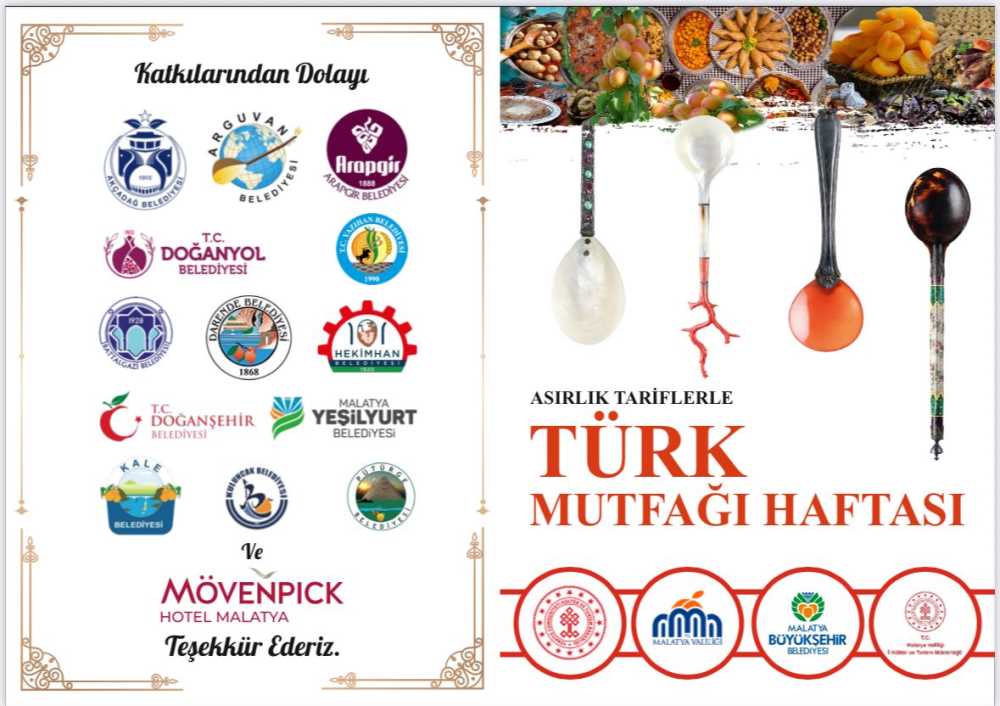 21-27 Mayıs tarihleri arasında kutlanan Asırlık Tariflerle Türk Mutfağı Haftası ilimizde de bir dizi etkinlikle kutlanacaktır. Bu etkinliklerin ilki bir otelde gerçekleştirilecek olup  özellikle yöresel yemeklere vurgu yapılacak olan program Malatya Sanat Merkezi'nde ilçe belediyelerinin de katılımıyla devam edecektir.