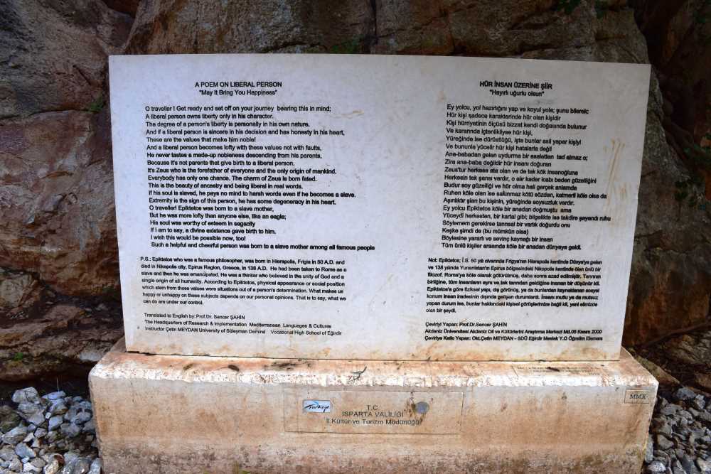 Dar patikada 300 metre yürüdüğünüzde karşınıza çıkan demir köprüden (N37° 27.795' E30° 54.837') kanyonunun diğer tarafına geçilir ve burada Epikür’ün “Hür İnsan” adlı şiirinin yazılı olduğu kayaya ulaşılır. Yazılı Kanyon’un adı da bu yazıttan gelmektedir.