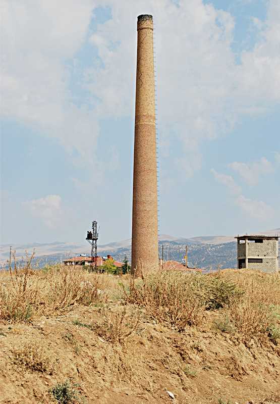Yukarı doğru daralan, silindirik formdaki baca, dolu harman tuğlasından örülmüş olup, yer yer metal kasnaklarla çevrilmiştir. |