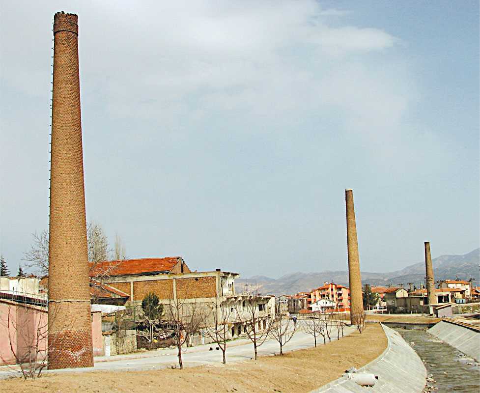Çay yolu üzerinde, kırmızı tuğladan yapılmış yukarı doğru daralan silindirik formda 4 adet fabrika bacası çay kenarında konumlanmıştır. |