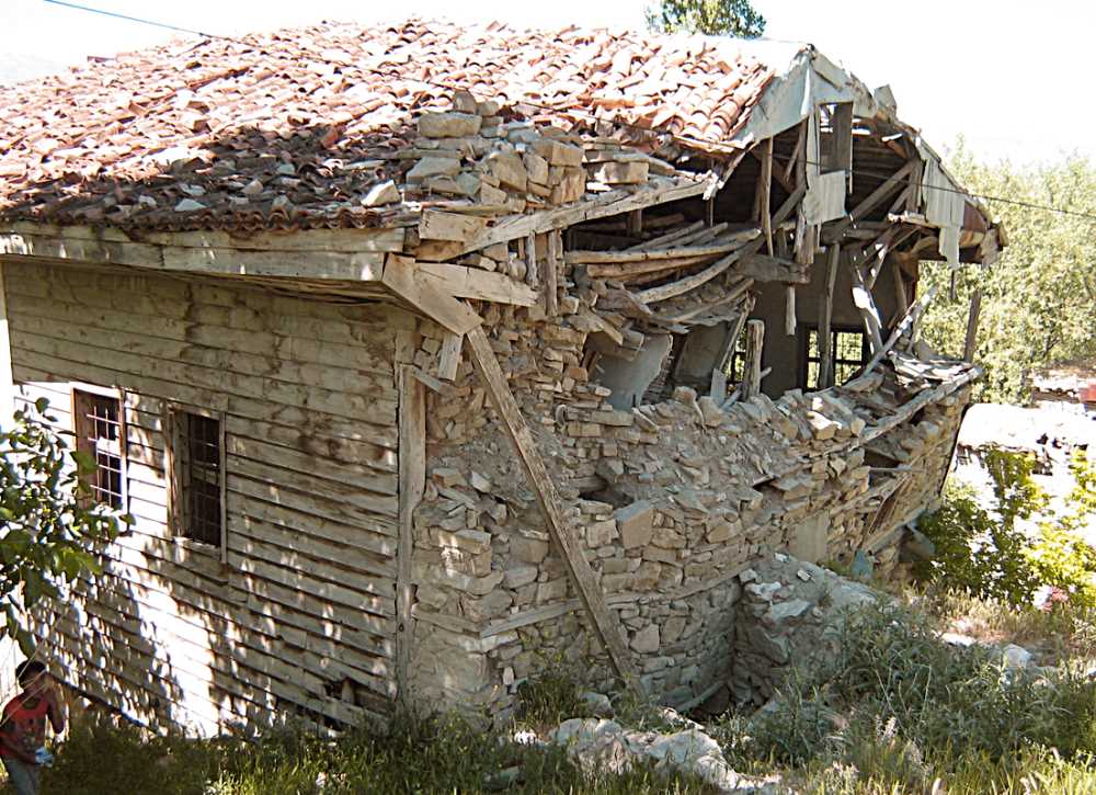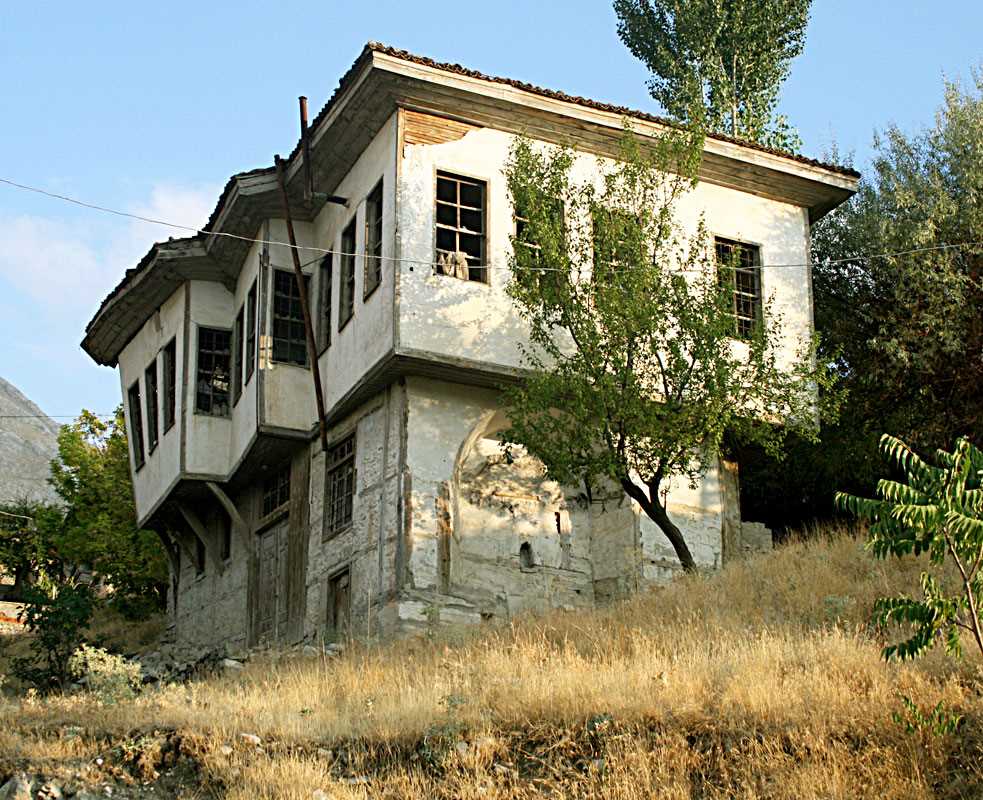 kiremit örtülü, verev çıkmalı iki katlı olan yapının, alt katı