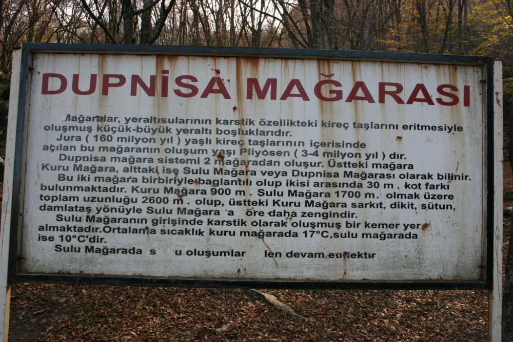 Türkiye, mağara literatüründe en çok bilinen mağaralardan biri olan Dupnisa mağaraları; yaklaşık dört milyon yıldan beri oluşum ve gelişimini sürdüren büyük bir yer altı sistemidir. İçinde sürekli akışa sahip bir yer altı nehri ve bu nehrin oluşturduğu, derinliği yer yer 2 metreyi aşan göller bulunan mağarada, zengin damla taş oluşumları yer alır. Süt beyazdan kırmızı ve kahverenginin her tonunda renge sahip olan ve dev boyutlara ulaşan sarkıt, dikit ve sütunlar ile perde ve bayrak damla taşları ve damla taş havuzları, insanı büyüleyici ve hayranlık uyandıran görünüme sahiptirler. Bu muhteşem görüntünün yanında, kısa mesafeler dahilinde değişiklik gösteren mağara havası, sağlık açısından olumlu sürprizler sunar. Üst katlar sıcak (ortalama 17 derece) ve kuru (%60-70 mutlak nem) olmasına karşılık, ana mağara daha serin (10-12 derece) ve nemlidir (%80-90). Bu farklılık, üst kat ile ana galeri arasında belirgin bir rüzgarın meydana gelmesine neden olmuştur.