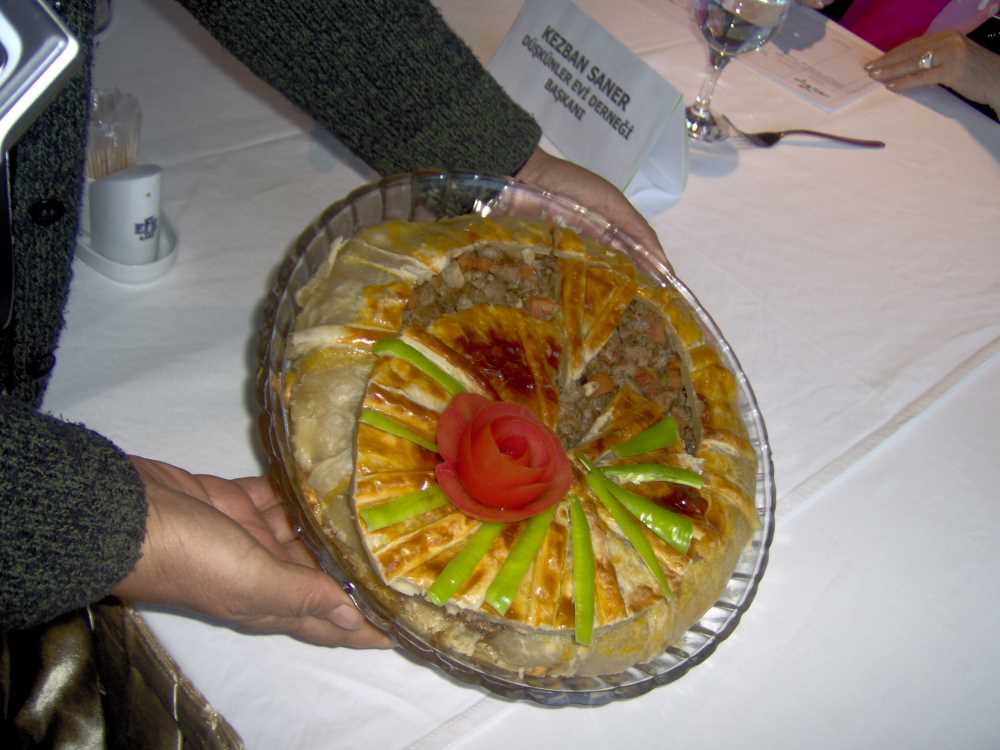 Malzeme: 750 gr kuzu kuşbaşı, Soğan, Domates, Biber, Sarımsak, Kekik, Pulbiber, Karabiber, Milföy Hamuru, Yumurta sarısı, Yemeğin Hazırlanışı: Et pişirilir diğer malzemeler sırasıyla ( soğan, biber, domates ve baharatlar) karıştırılarak pişirilir. Milföy hamuru kalıba yerleştirilir üzerine kuşbaşını ve pişirilmiş iç pilav doldurulacak hamur kapatılır ve fırın tepsisine ters çevrilerek yumurta sürülür, üzeri kızarınca çıkarılır ve servis yapılır.