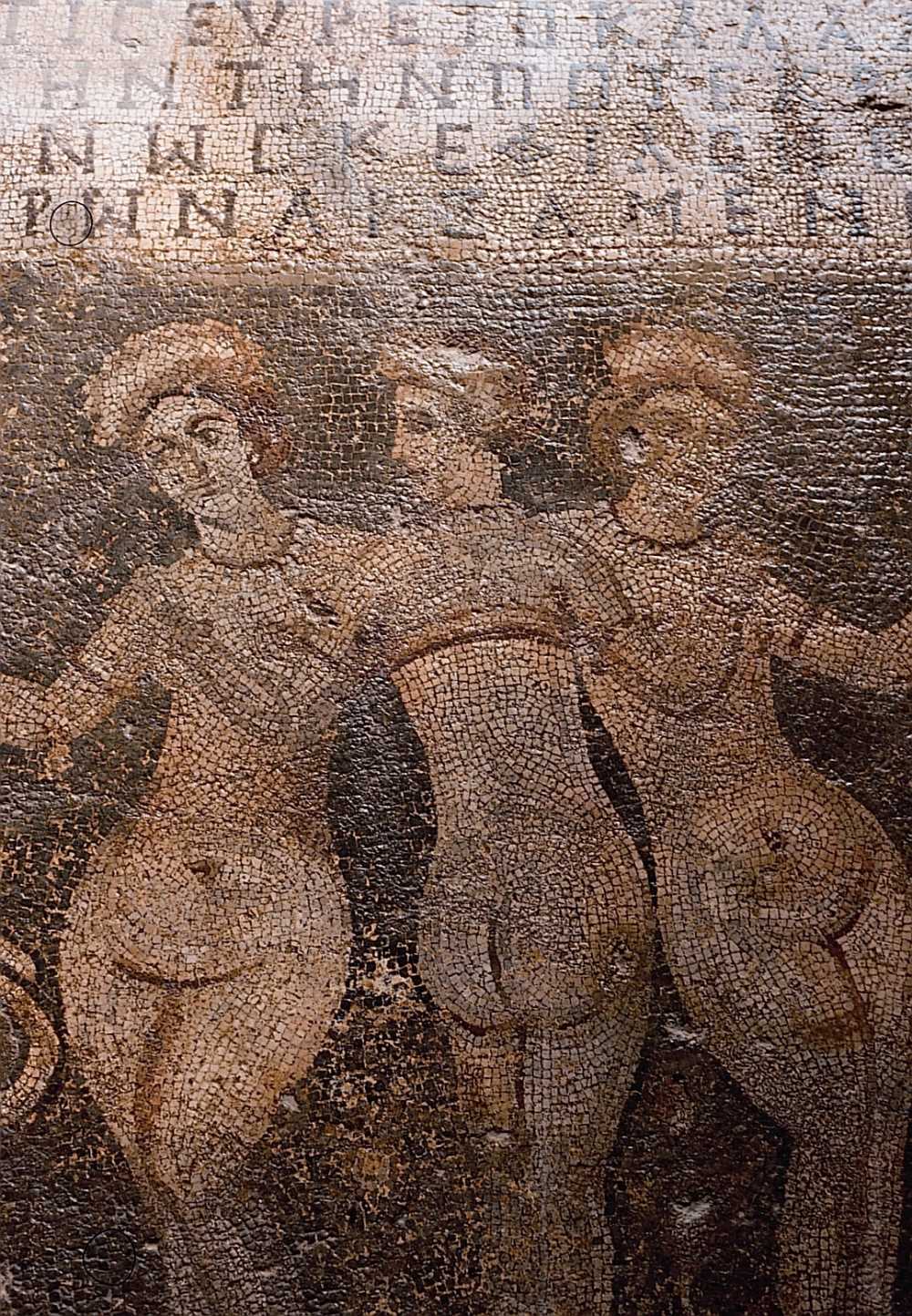 Ayrıca tanrıçaların üzerinde bir yazıt bulunmaktadır. Bu yazıtta : “ Ey, dost, bu güzel hamamın suyunun saklı olan kaynağını kimin bulduğunu sorarsan, bil ki o kişi, kutsal adaları dürüst yöneten ve imparatorların da dostu olan Poimenios’ tur ”ifadeleri bulunmakta ve hamamı yaptıran kişinin adını vermektedir.