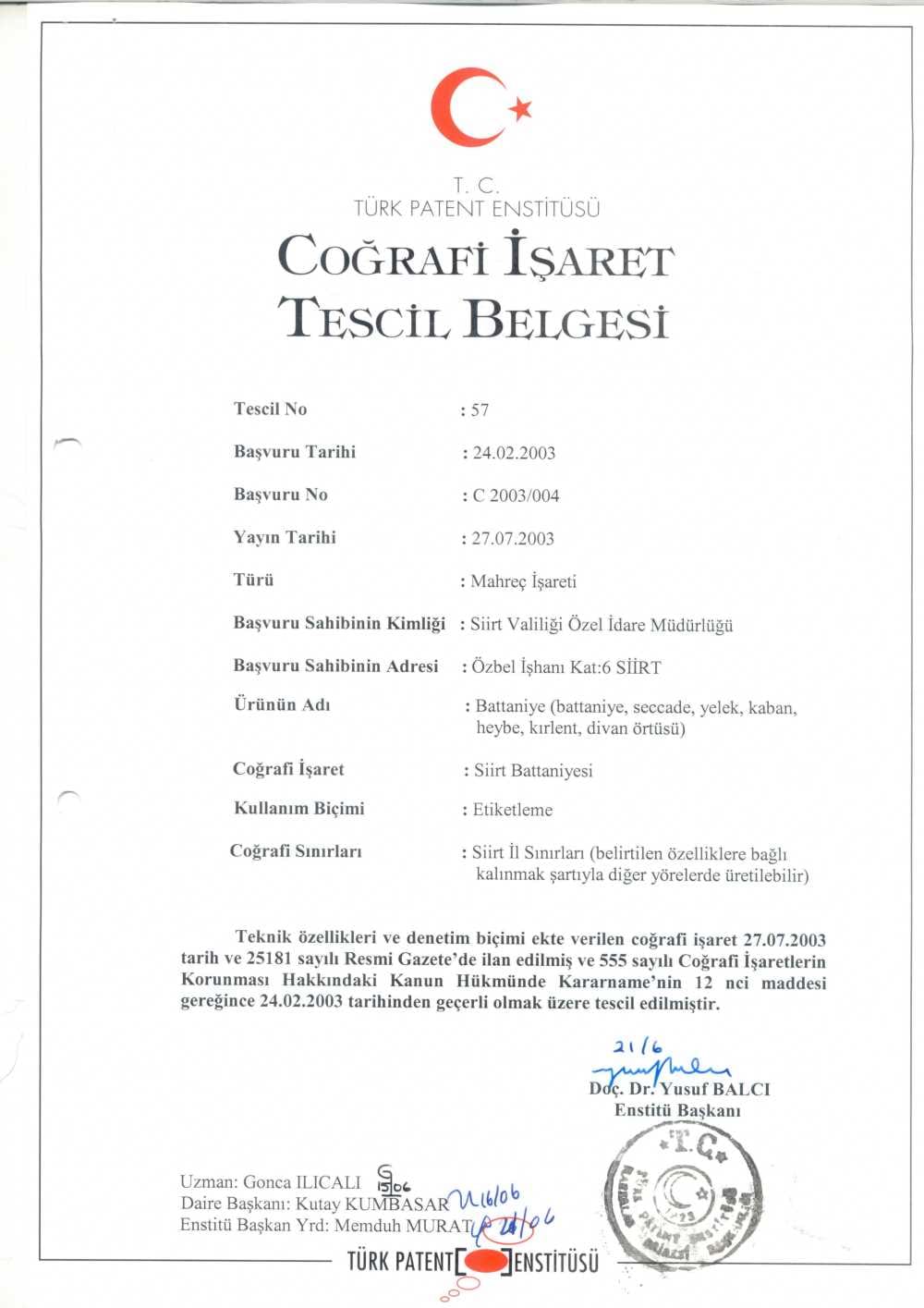 Türk Standartları Enstitüsü tarafından 2003 yılında tescil edilen Siirt Battaniyesi, özellikle turistik çevrelerde geniş bir pazar imkânına sahip. Başta Amerika olmak üzere dünyanın birçok bölgesine ihraç edilmekte olup Siirt’e gelen misafirlere saf tiftikten dokunan Siirt Battaniyesi hediye etmek gelenek haline gelmiştir.