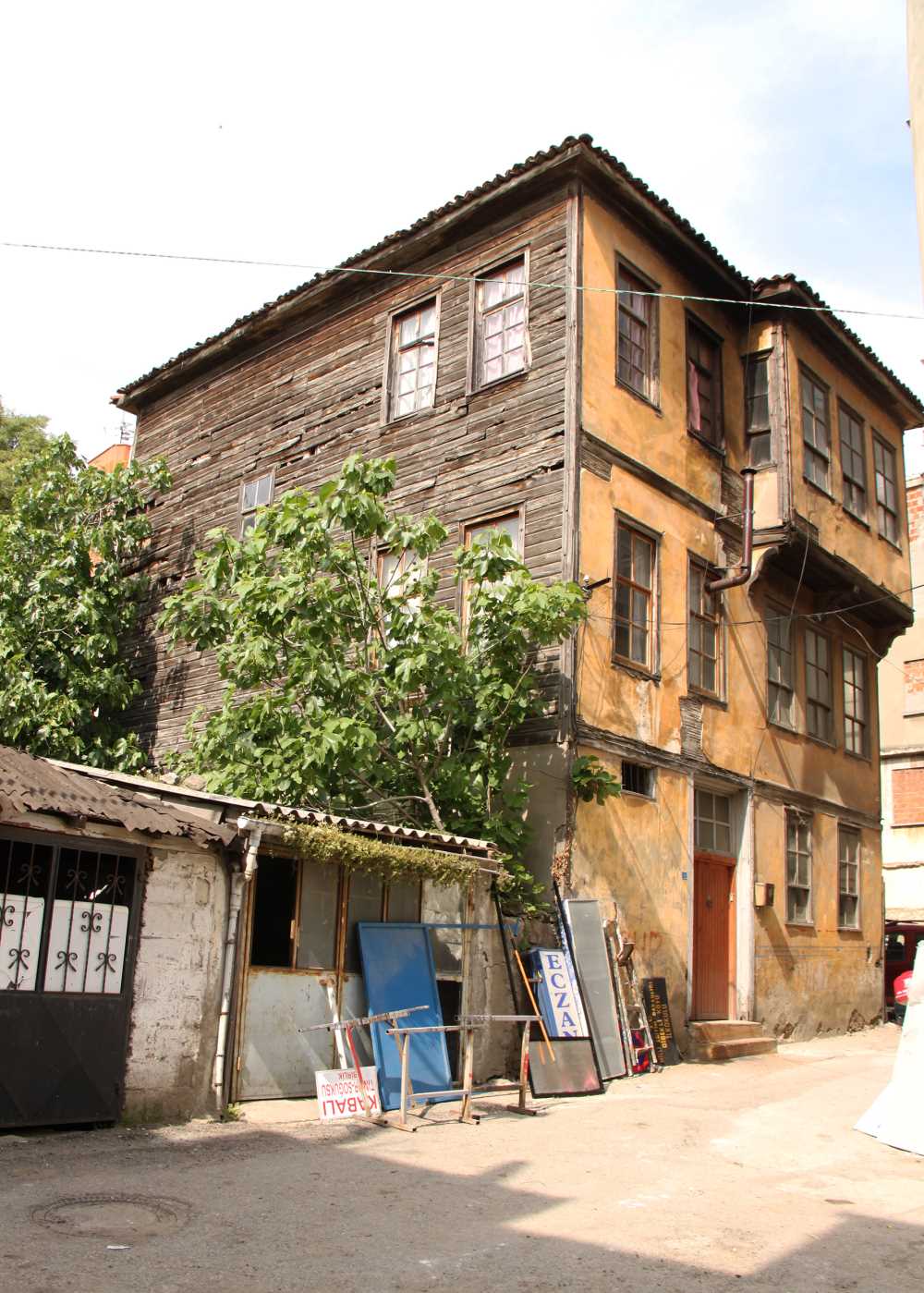 Üç katlı olarak inşa edilen yapının girişi, birinci kattan çift kanatlı ahşap kapı ile sağlanmıştır. |