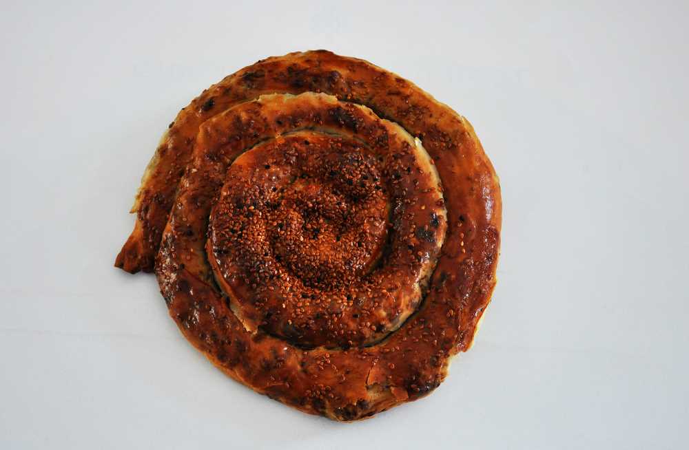 Sinop’ta çok yaygın olarak yapılan bir börek çeşididir. Bilhassa dini bayram günlerindeki ziyaretlerde gelen misafirlere yapılan ikramların başında yer alır. Kıymalı, üzümlü-cevizli ve yoğurtlu olmak üzere çeşitleri vardır. Malzemeler (Kıymalı için): Un, su, tuz, maya, yağ, soğan, kıyma, tuz, karabiber, karanfil (kıymalı için) Yapılışı: Un, su, tuz ve maya karışımıyla kulak memesi yumuşaklığında bir hamur yoğurulur ve dinlenmeye bırakılır. Diğer tarafta ince doğranmış soğanlar sararıncaya kadar yağda kavrulur. İçine yine başka bir tencerede önceden kavrulmuş kıyma, tuz, karabiber ve isteğe göre karanfil eklenir ve bir süre daha kavrulmaya devam eder. Mayası gelen hamur 15-20 cm çapında parçalara bölünür ve oklavayla açılır. Açılan hamur yağlanır. Hamurun üzerine hazırlanan içten bir miktar konulup dağıtılır. İç konulduktan sonra hamur rulo şeklinde yuvarlanır ve yağlanmış tepsiye döşenir. Döşeme işlemi bittikten sonra bıçakla üçer cm aralıklarla yarım olarak kesilir. Böylece hamur parçaları hem birbirinden kopmaz hem de içi pişmiş olur. Üzerine yumurta ve arzuya göre çörek otu serpilerek orta ısıdaki fırında pişirilir. KAYNAK: Sinop Valilliği (1993), “Sinop İl Yıllığı”, Ankara
