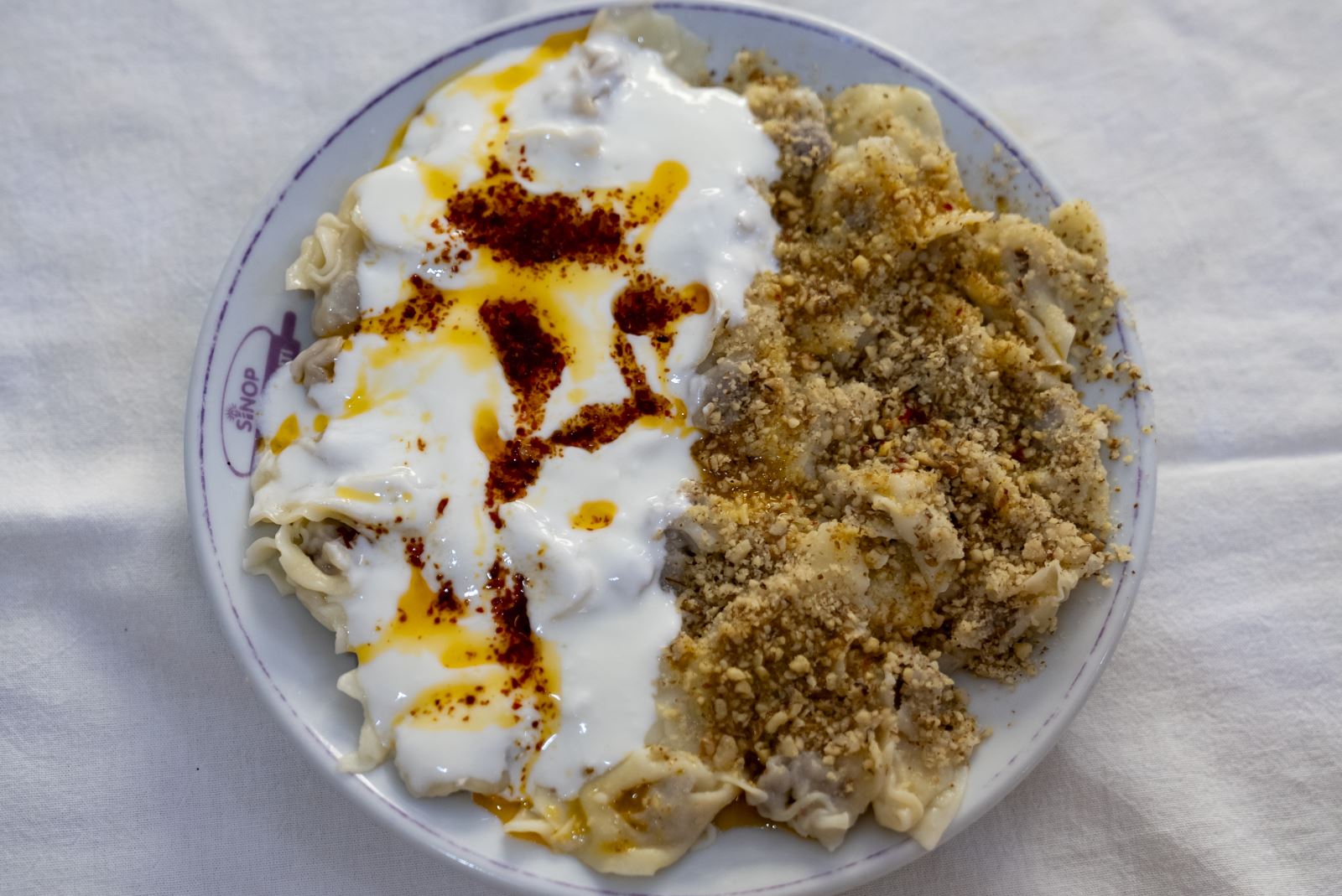 Sinop Mantısı; 1 - 2 mm kalınlığında açılan hamurların içine yağsız ve sinirsiz dana kıyma konulup kulak şeklinde büküldükten sonra haşlanması suretiyle üretilen ve yarısının ceviz içiyle diğer yarısının ise sarımsaklı yoğurtla aynı tabakta servisi yapılan mantıdır.