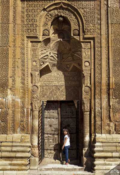 yaptırılan Çifte Minareli Medrese’dir. Günümüze sadece ön cephesi ulaşabilen yapının bitkisel, geometrik ve yazılı bezemelere sahip cephesi ile çifte minareli taç kapısı ihtişamını göstermeye yeterlidir. Medresenin köşe kulelerinde bulunan ve aydınlığı temsil eden mum tasvirleri dikkat çekicidir.