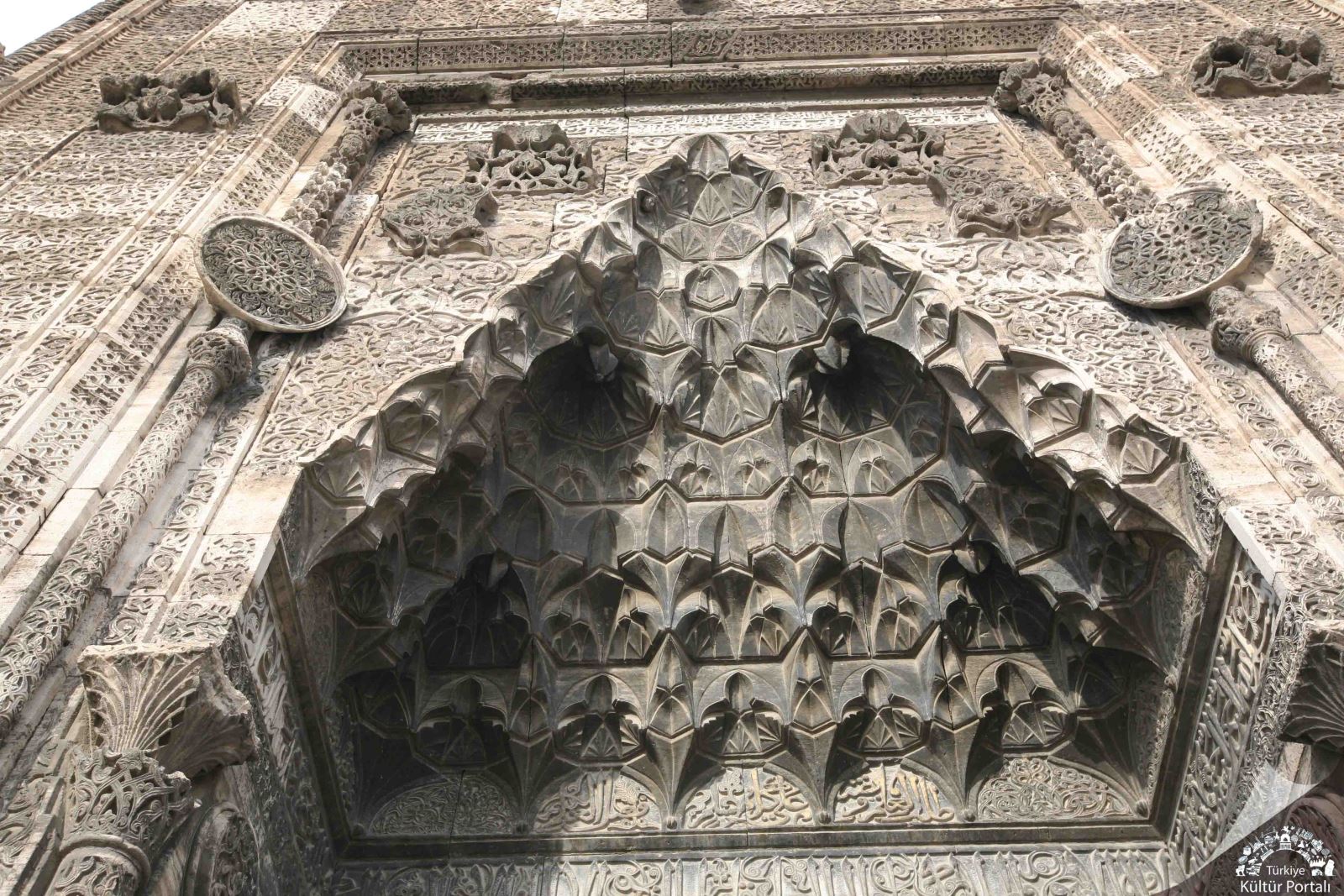 Medresenin taç kapısı üzerinde; Arapça, ‘İlim talep etmek her Müslümana farzdır’ hadisi dört bölüm halinde kabartma olarak yazılmıştır. Yapıda kesme taş, moloz taş, devşirme, tuğla ve çini olmak üzere beş tür malzeme kullanılmıştır.