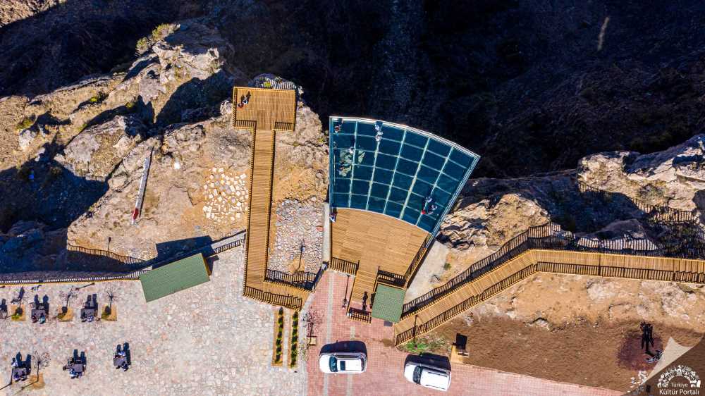Divriği Cam Seyir Terası, Çaltı Kanyonu’na hâkim tepe üzerinde doğal doku muhafaza edilerek 1200 metre uzunluğunda ahşap yürüme parkurları, ahşap ve cam seyir alanı ile oluşturulmuştur.
