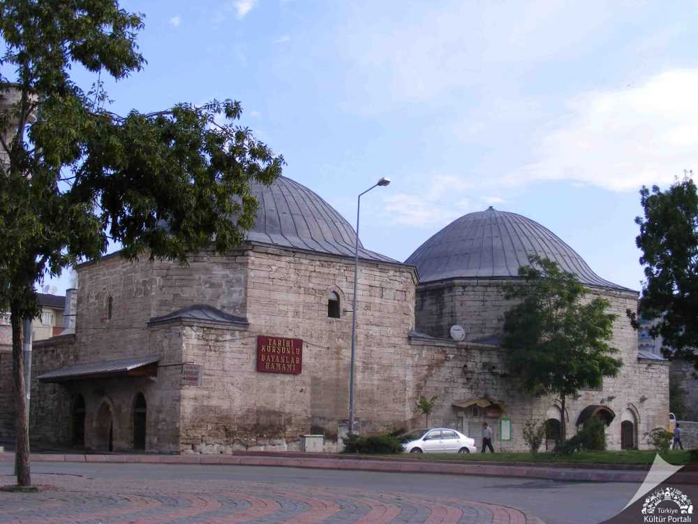 Beden duvarlarında bulunan demir bağlantılara kurşun dökülerek inşa edildiği için Kurşunlu Hamamı adı verilen yapı, 1576 yılında Behram Paşa tarafından kesme taştan çifte hamam olarak yaptırılmıştır. Osmanlı Devri klasik hamamlarının özeliklerini taşıyan hamamda kadınlar ve erkekler için ayrı bölümler vardır. Halen hamam olarak hizmet vermektedir.