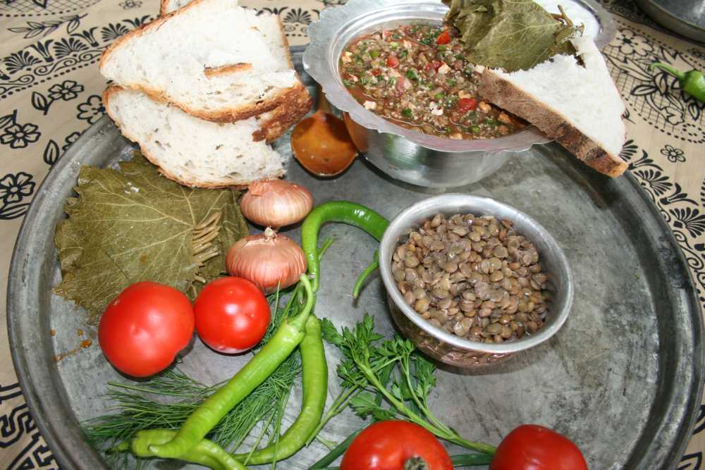 • 2 su bardağı haşlanmış yeşil mercimek • 2 çorba kaşığı salça • 2 adet domates • 2 adet yeşil biber • 2 adet kuru soğan • Yarım demet yeşil soğan • Yarım demet maydonoz • Yarım demet dereotu • 1 çay bardağı dövülmüş ceviz • 1 çorba kaşığı kuru reyhan • 1 fincan ince bulgur • 1 tatlı kaşığı pul biber • Tuz • 200 gr. Üzüm yaprağı • 5-6 dilim ev ekmeği