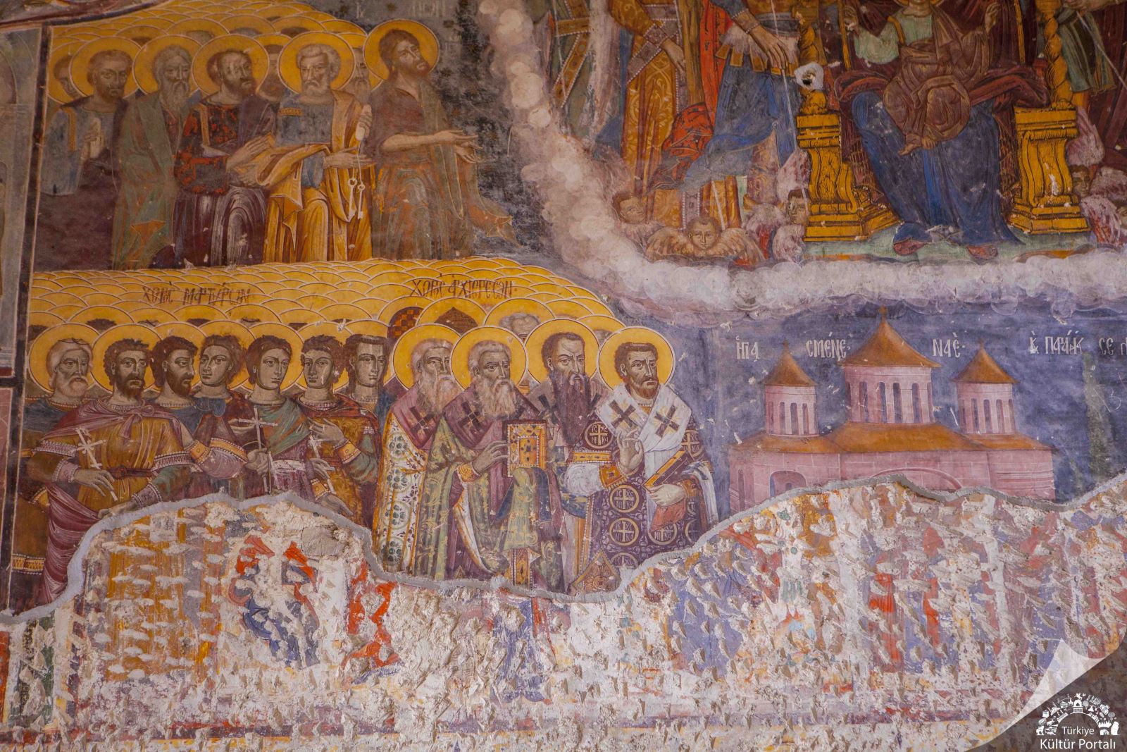 Manastırın ana ünitesini meydana getiren kaya kilisesinin ve ona bitişik şapelin iç ve dış duvarları fresklerle donatılmıştır. Kaya kilisesinin içinde avluya bakan duvarda III. Alexios dönemine ait fresklerin varlığı tespit edilmiştir. Şapeldeki freskler ise 18'inci yüzyılın başlarına tarihlenmektedir ve üç ayrı devirde yapılan üç tabaka görülmektedir. En alt tabakanın freskleri daha üstün niteliktedir.